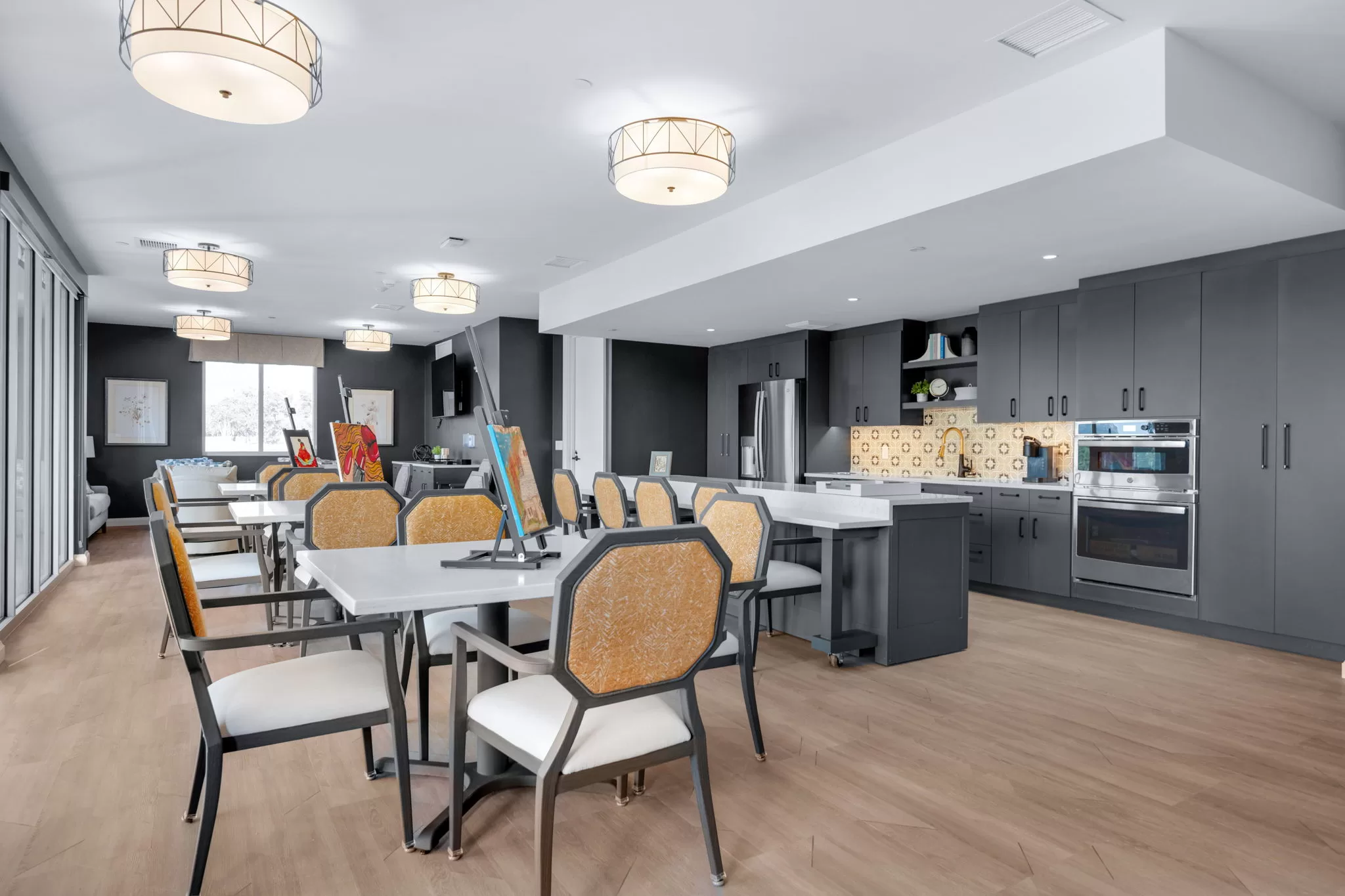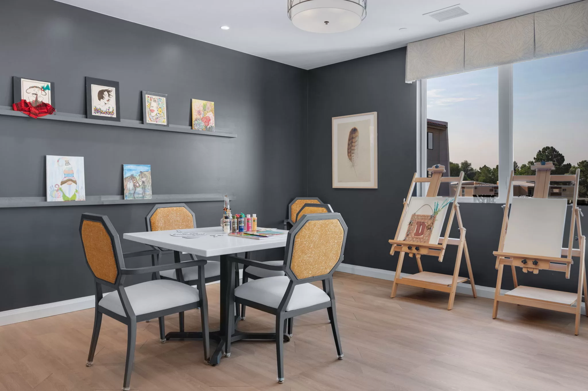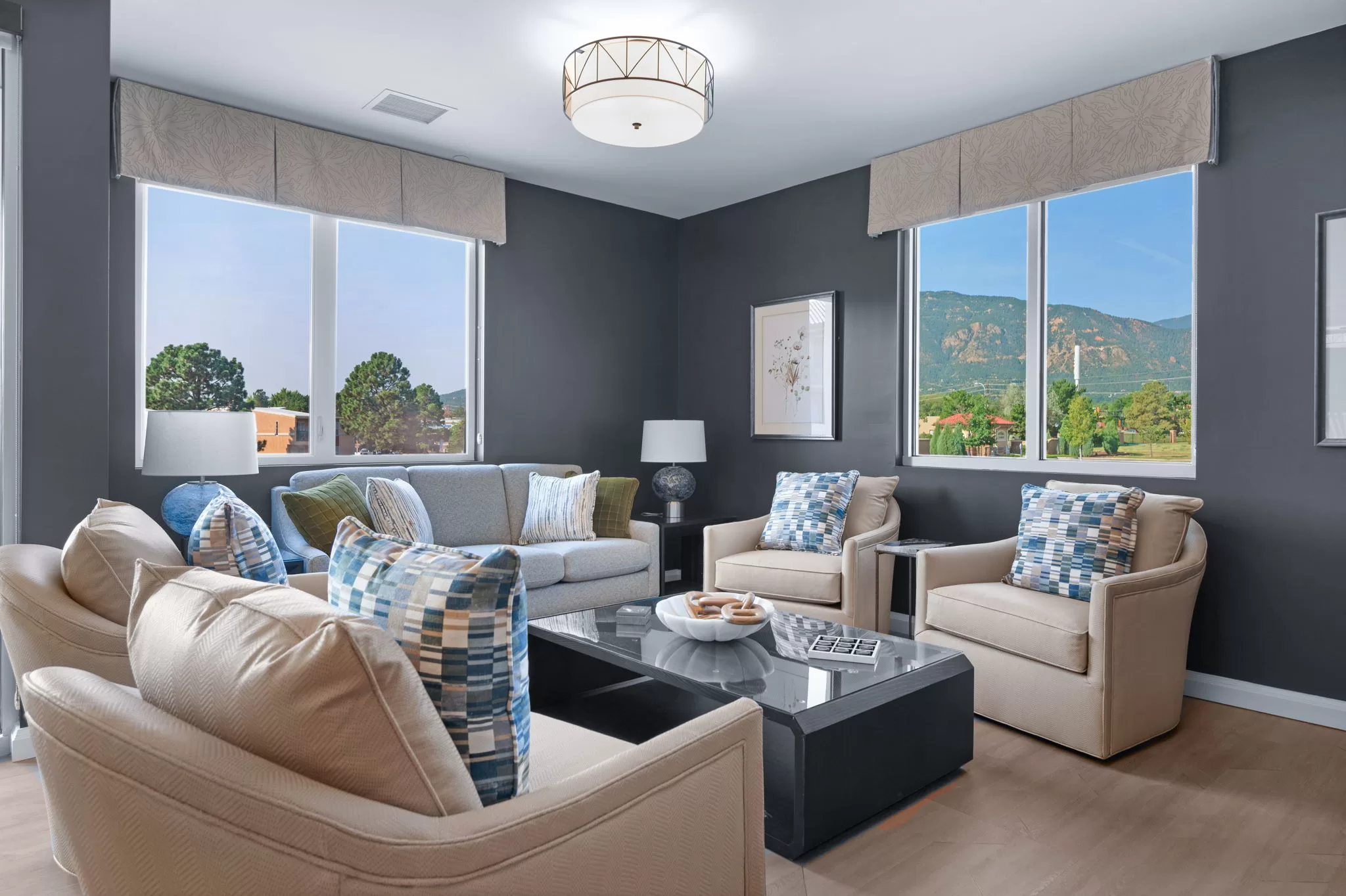 Throughout the interiors, custom FF&E selections double as storytelling tools, celebrating Colorado Springs’ local history and sparking meaningful conversations. This narrative approach to design ensures that every corner of the building holds both beauty and purpose. Our goal was not simply to beautify the space, but to design for dignity and connection. Central amenities such as the two-story lobby, Bistro, Grab N Go Marketplace, Club Room, Craft Room, and full-service kitchen are designed to foster community, creativity, and well-being. Each space transitions seamlessly into the next, encouraging both spontaneous interaction and planned gathering. Whether it’s enjoying a game at the Bistro Bar, attending a cooking class, or hosting a multigenerational family event, the building supports a rich, connected lifestyle.
